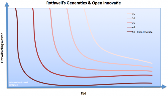 In onderstaande figuur worden de kosten van innovatie in de tijd uitgezet voor ieder van de 5 generaties. Duidelijk is dat bij toepassing open innovatie (5G) de kosten al in een veel sneller stadium afnemen en dat de time-to-market veel sneller is.
