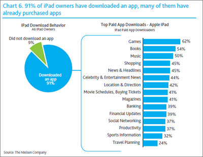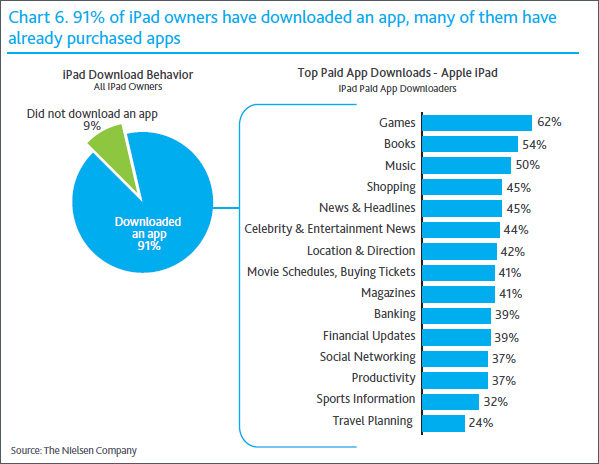 Het downloaden van apps is populair en wordt door 91 procent van de gebruikers gedaan. Vreemd genoeg was dit percentage in de originele versie 68 procent en werd dit gisteren gewijzigd naar 91 procent. Onder de betaalde apps zijn games het meest populair (62%), gevolgd door boeken (54%) en daarna shoppen en nieuws lezen (beide 45%).