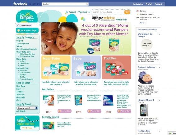 De webwinkel van Pampers op Facebook is een samenwerking met Amazon webstore de geheel vernieuwd is. ( een volledig e-commerce platform om zelf simpel een professionele webwinkel te starten tegen zeer lage maand kosten, TIP!) maar nog niet een standaard functionaliteit van Amazon Webstore om je webwinkel binnen Facebook te plaatsen.