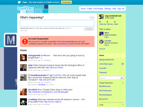 Nondejuu. Mijn Twitter-account is suspended sinds vannacht of vanmorgen. Ik heb net de gebruiksregels van Twitter doorgenomen en volgens mij heb ik géén violations begaan. De helpdesk van Twitter is er mee bezig, ik moest ze overtuigen dat ik echt geen kwade bedoelingen had (ik heb geen e-mail van Twitter ontvangen met waarschuwingen en ik kom het contactform niet eens in) maar nu is het alweer anderhalf uur stil vanuit de US of A. Ik moet zeggen dat ik me onthand voel en ik zal Marketingfacts niet misbruiken om te vertellen wat ik zo meteen ga doen, maar toch. Een communicatiemiddel waar ik misschien wel niet meer zonder kan, valt opeens weg. Weird.
