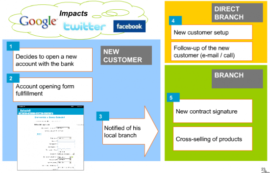 Ik haal graag nog een keer het voorbeeld van Banco Sabadell aan. Banco Sabadell gaat uit er vanuit dat een positieve beeldvorming over het merk en haar producten en diensten in social media de verkoop stimuleert. Ze verwachten dat consumenten onder invloed van Google, Twitter, Facebook, en dergelijk online een rekening openen. In het after sales proces daarna, worden zowel een lokale bankfiliaal als de directe kanalen betrokken. Dit alles met als doel om uiteindelijk de cross sell te verhogen.