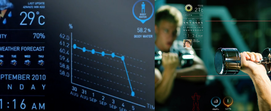 De andere unieke feature van de spiegel is wellicht nog interessanter: het feit dat je jezelf erin kunt zien. Het gebruiksmoment van de spiegel is er een van verzorging van je lichaam: tanden poetsen, gericht wassen, je haar doen, etc. Door middel van de screen technology in de spiegel zijn hier nog veel meer mogelijkheden. De ingebouwde camera herkent de gebruikers. Sensors in de vloer meten alle zaken die een beetje geavanceerde weegschaal van tegenwoordig meet (gewicht, vocht- en vetgehalte, etc), en de resultaten hiervan worden op de spiegel geprojecteerd. Direct wordt er een grafiek gegenereerd van het verloop van je gewicht over de afgelopen maand. Zit je in toenemende groei? Alvast maar een extra bezoekje aan de fitness inplannen in de agenda. Daarnaast kunnen toekomstige self-check apparaten worden ingebouwd zodat ook die gegevens kunnen worden uitgelezen. Denk aan het meten van je hartslag, het tellen van je grijze haren en het gegevens uitlezen van een pacemaker. “Ik adviseer u om uw gezichtshaar vandaag te scheren”.