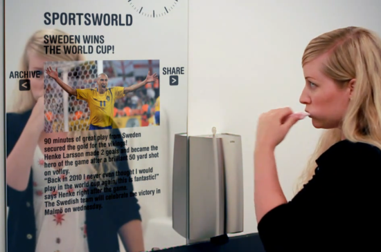Touchscreen op de spiegel? Ik hoop dat je er een doekje bij krijgt. Misschien is het handig om een spiegel te maken die zichzelf schoonmaakt. Dan wil ik er ook zo een.