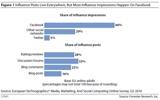 Uit het rapport komt naar voren, dat 11 procent van de Europese volwassenen verantwoordelijk is voor 80 procent van de creatie van ‘influence posts’ online: dat gaat nog een stapje verder dan het Pareto principe want slechts 4 procent van deze groep is verantwoordelijk voor de verspreiding van de influence posts. Conclusies van Forrester zijn verder nog dat de verschillen in waar de invloedbewegingen zich afspelen op nationaal niveau zijn terug te brengen naar historisch gebruik van social media per land. In de UK en Duitsland is Facebook voor 70 procent verantwoordelijk voor de verspreiding van de influence impressions, in Nederland is dit ‘slechts’ 50 procent. Over de verschillen in geslacht en leeftijd: