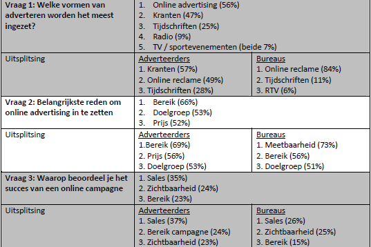 De helft van de adverteerders heeft moeite om succes online reclamecampagne te bepalen en er bestaat behoefte aan één meeteenheid voor de effectiviteit van online reclame, dat zijn er nu teveel. Waar bureaus op dit moment het liefst inzetten op online adverteren (84%), zien adverteerders hun reclame nog steeds het liefst in de krant (57%), gevolgd door online (49%). Veertig procent van de respondenten heeft belangstelling voor softwareontwikkeling voor adverteren op smartphones. Het blijkt allemaal uit onderzoek van online reclametechnologiebureau Adrime dat door Panelwizard werd uitgevoerd onder 420 bureaus en adverteerders. Hieronder meer over de resultaten en de methode: