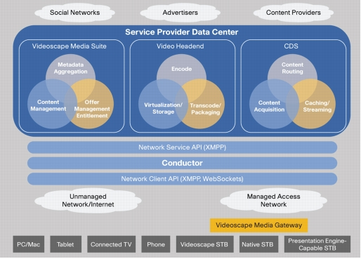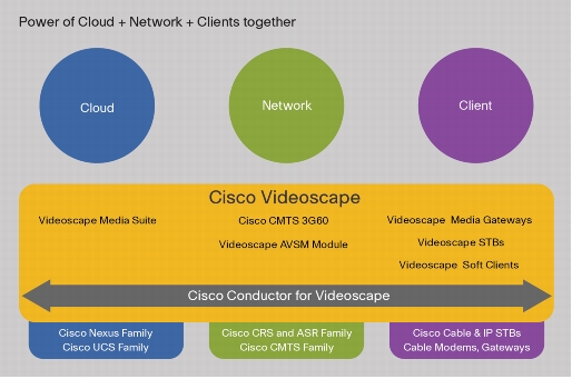Videoscape bevat voor thuis een Media Gateway voor de integratie van spraak, lineaire en online video, high-speed data, Wi-Fi- en netwerkverkeer-routing, een IP set-top box, ontworpen om alle vormen van video te kunnen bekijken op tv, inclusief pay-tv, reguliere tv-zenders, premium kanalen, video on demand en het web en software clients die de Videoscape-ervaringen uitbreiden naar diverse consumentenapparaten voor zowel mobiel als thuisgebruik, zoals tv’s, tablets, smartphones en nog veel meer. In de ‘cloud’ (ik krijg nog steeds jeuk van die term) biedt een Media Suite volledig lifecycle contentmanagement, zodat service providers efficiënt en kosteneffectief content kunnen beheren en publiceren voor meerdere schermen en in het netwerk biedt Cisco een ‘Conductor’ voor Videoscape die verschillende diensten orkestreert en verschillende diensten en de beheerfuncties voor abonnementen in de cloud, het netwerk en client devices verwerkt.