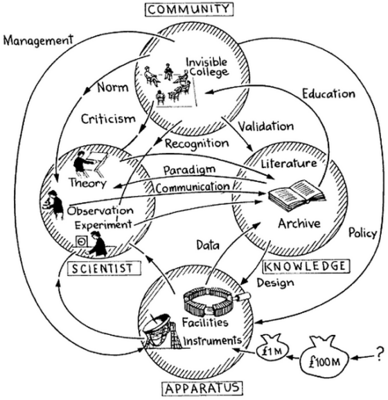 In zijn boek Puzzles, Problems, and Enigmas: Occasional Pieces on the Human Aspects of Science (1981, 2010) schetst Ziman het bovenstaande beeld van de manier waarop de kennisdynamiek werkt in Big Science, gebruiker en producent van kennis bij uitstek. Indachtig de kerncombinatie van Science, Technology & Innovation (Oslo Manual, 1992, 1997, 2005) kan deze plaat worden toevertaald naar organisaties. Substitueer product of dienst voor de omgang met het apparaat en maak van de wetenschapper een ondernemer. Community staat dan voor het ecosysteem van partners en afzetmarkt.