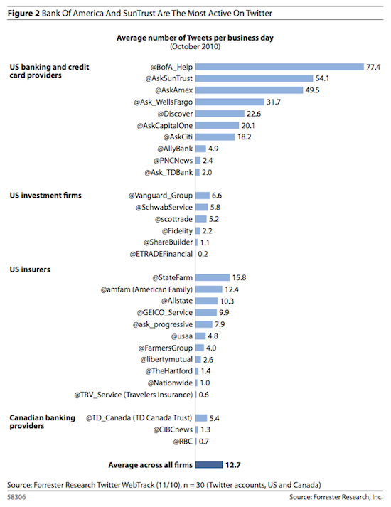 Twitter scoort als platform erg goed bij de Fortune 100 gevolgd door bloggen en Facebook bleek uit onderzoek halverwege 2010 van Burson-Marsteller. Toch gaan de onderzochte financials verschillend om met twitter. Voor customer service en promotie wordt het al vrij snel ingezet, maar slechts een zeer beperkt aantal van de onderzochte accounts speurt actief op het web naar tweets over klachten of met vragen, om vervolgens pro-actief customer support te bieden via twitter.