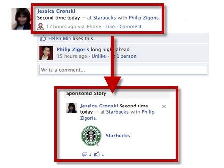 Stel, je “checkt in” bij een Starbucks of soortgelijke organisatie. Jouw check-in is op dat moment zichtbaar voor vrienden. Tot zover niks vreemds. Want het is immers jouw check-in. Maar wat er vervolgens kan gebeuren is dat die specifieke check-in als een advertentie aan de zijkant als ‘Sponsored Story’ verschijnt. Hierbij verschijnt dan ook het logo van de ‘adverteerder’. Ineens ben je onderdeel van een advertentie. En dit gebeurt niet alleen bij het inchecken op een plek, maar ook als je bijvoorbeeld een van de adverteerders “liked” op Facebook.