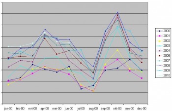 De Nielsen data laat zien dat in bijvoorbeeld de autobranche in de maanden april en oktober pieken te zien zijn. Dit betekent dat in deze maanden autobedrijven meer media inzetten richting hun doelgroepen.