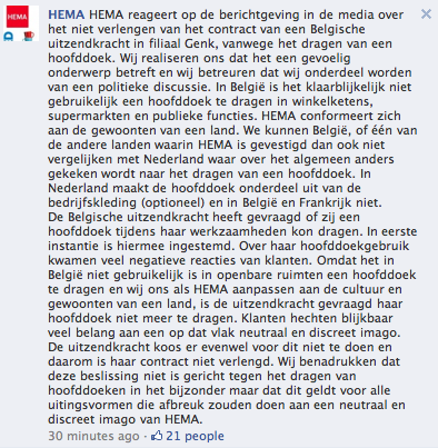 Anneli, ik denk dat je je nooit tegen de idiotie van mensen en lobbygroepen kunt wapenen. De belangrijkste fout die HEMA eventueel zou kunnen aangewreven worden is dat ze misschien de mentaliteit van veel van mijn landgenoten niet kennen. Uiteraard zorgen die klagende klanten voor nervositeit maar HEMA had hier net een statement kunnen van maken: “HEMA, waar iedereen welkom is”. Maar je kunt hen weinig verwijten. Ik hoorde het hele verhaal deze ochtend op de radio. De reactie van het interimkantoor was dat HEMA het recht heeft om “uniformvoorwaarden” voor te schrijven aan z’n werknemers en ze hebben een punt. Het Centrum voor Gelijke Kansen zei dan weer dat mensen niet mogen worden ontslagen omwille van soortgelijke redenen en als verdraagzame wereldburger moet ik hen ook een punt geven. Ik denk niet dat dit over sociale media gaat maar om mensen en maatschappijen. En mensen gebruiken nu eenmaal sociale media. In België is iemand ontslaan omdat anderen zich storen aan een hoofddoek of ander religieus symbool gegarandeerd vragen om problemen uit verschillende hoeken. Men probeert hier een zeer strikte norm op dat vlak te hanteren vanuit bepaalde organisaties. De eenvoudige waarheid is dat die mentaliteit haaks tegenover die van veel Belgen staat waar hoofddoeken werken als rode lappen op een stier. Als het inderdaad in Genk was, is dat nog te ironischer omdat Genk en omstreken de regio’s zijn waar een groot percentage allochtonen woont, daterend uit de tijd dat België “vreemdelingen” liet over komen om in de steenkoolmijnen in deze buurt te werken. Ik persoonlijk vind beide partijen fout en vind het een polarisering die compleet belachelijk is. Laat mij maar bedienen door iemand met hoofddoek of wat dan ook, laat de mensen die klagen omdat ze bediend worden door iemand met hoofddoek verder vaandels zwaaien in hun van vooroordelen bezwangerde onverdraagzaamheid en laat ons de belachelijke polarisering en pogingen om “politiek correct te zijn” van sommige organisaties in dit land vooral kaderen in de maatschappelijk en politieke onmacht die er heerst. Dit heeft weinig met sociale media te maken maar veel met België. Moest Nederland nog het verdraagzame land van vroeger zijn (jammer dat er ook wat vreemde dingen gebeuren), was ik al lang van nationaliteit veranderd. Hema reageert correct, het had alleen beter de lokale idiotie, excuseer, situatie, beter moeten inschatten. Albert Heijn weze gewaarschuwd.