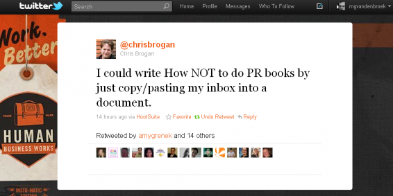 Ik heb absoluut geen moeite met onpersoonlijke persberichten, maar waar ik mij echt groen en geel aan irriteer is persoonlijke verzoeken (met fout geschreven namen) om plaatsingen waar ze het medium van een ander in vermelden. Dikke #fail