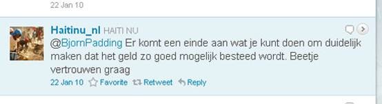 Bij de SHO-actie voor Haiti bleek dat er nogal wat kritische tweets waren over de besteding van het hulpgeld, zeker omdat veel mensen meenden dat de hulpgelden van de tsunami (Azie) nog op een grote hoop lagen of slecht waren besteed. NB: de monitoring ging toen nog via Google alerts!