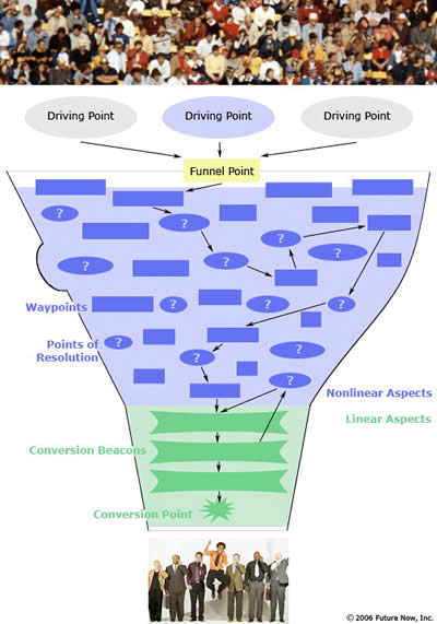 Conversie is immers een kwestie van psychologie. Allicht zijn velen min of meer vertrouwd met de wat verouderde ‘persuasion architecture’ van Eisenberg (zie afbeelding), kennen velen de ‘persuasion principles’ en hopelijk weten velen ook dat menselijke beslissingen veel minder rationeel zijn dan men pleegt te geloven.