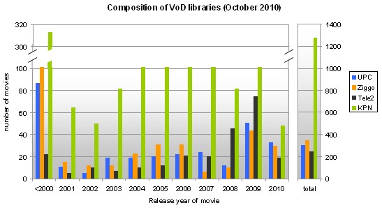 KPN is wederverkoper van het aanbod van Videoland en heeft het grootste aanbod van 1275 films. UPC biedt ongeveer 300 films aan, Ziggo 350 en Tele2 250. Ziggo en UPC gaven aan bewust niet veel meer films aan te bieden, omdat dit onbedienbaar wordt met een afstandsbediening gegeven de huidige systemen. 25% van de films van KPN zijn ouder dan 10 jaar. Bij UPC is dit ongeveer 30% en bij Ziggo ongeveer 40%. Meer dan 50% van het aanbod van deze drie partijen is ouder dan 6 jaar. Het aanbod van Tele2 is het meest up to date met 60% van de films minder dan 3 jaar oud. Positief is dat iedere aanbieder zo’n 60-150 films heeft van 2009 of later.