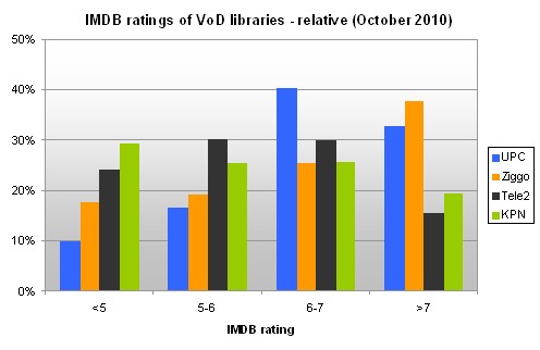 “Ziggo en UPC hebben de best gewaardeerde films. Meer dan 60% van ven de films in het Ziggo aanbod en 73% van de films in het UPC aanbod hebben een rating van kleiner dan 6. KPN heeft de slechtst beoordeelde films: 54% heeft een rating van kleiner dan 6.”