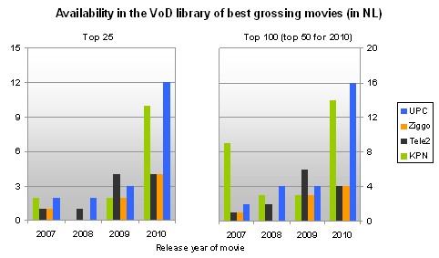Van de Top 25 in 2010 waren 12 titels aanwezig in het UPC aanbod en 10 in het KPN aanbod. Ziggo en Tele2 hadden slechts 4 films in hun aanbod. Opvallend is dat van de best verkopende films uit 2009, 2008 en 2007 bijna geen films aanwezig zijn in het aanbod.