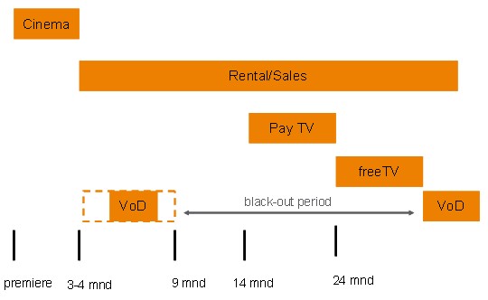 Vervolgens gebeurt er iets opmerkelijks. De film wordt uit de Video on Demand store gehaald om een black-out perdiode in te gaan. Pas nadat de film is aangeboden aan PayTV en ‘gewone’ omroepen kan de film weer terugkeren in het VoD aanbod. Voor deze constructie wordt gekozen omdat het VoD window teveel zou kunnen kannibaliseren op de PayTV window, die hoge bedragen betalen voor exclusief recht op de televisie.