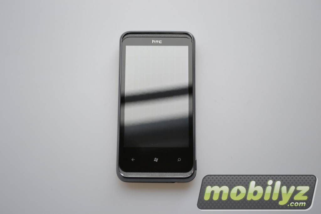 Aan de voorzijde vinden we het scherm met daaronder de drie (eveneens capacitieve) knoppen die voor Windows Phone 7 verplicht zijn: Back, Home en Search. Daarboven en daaronder prijkt een dunne grill, waarvan de onderste overigens geheel voor de sier lijkt te zijn geplaatst. Het geheel is omlijst door een donker chromen sierrand.