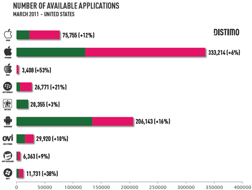 Eén van de belangrijkste kritieke succesfactoren is het aanbod van apps. Uit het laatste rapport van Distimo blijkt het aanbod van de Windows Phone Marketplace te staan op meer dan 11,5 duizend applicaties. Daarmee is het aanbod binnen maand met 38 procent gestegen. Als het deze groei doorzet, verwacht Distimo dat binnen 5 maanden Windows Phone Marketplace groter is dan de Ovi Store. In Nederland zijn er 580 geregistreerde ontwikkelaars voor Windows Phone 7. Samen hebben zij 175 applicaties ontwikkeld. En dat terwijl er nog geen officiële Nederlandstalige versie van Windows Phone 7 is. Wereldwijd zijn er 38.000 geregistreerde ontwikkelaars, waarvan er 7300 een of meer apps hebben uitgebracht. Van de aanwezige applicaties is 61 procent tegen betaling te downloaden. Er worden echter flink meer gratis applicaties gedownload. Van alle applicaties die worden gedownload is slechts 3,2 procent betaald. De gemiddelde gebruiker downloadt 12 applicaties per maand.