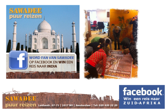 De social media actie moet aansluiten bij je offline activiteiten. In Metro promootte Sawadee de Facebook-actie in het kader van een vijfdaagse print campagne met redactionele ondersteuning. Ook tijdens de Vakantiebeurs werd de actie gepromoot met banners en flyers.