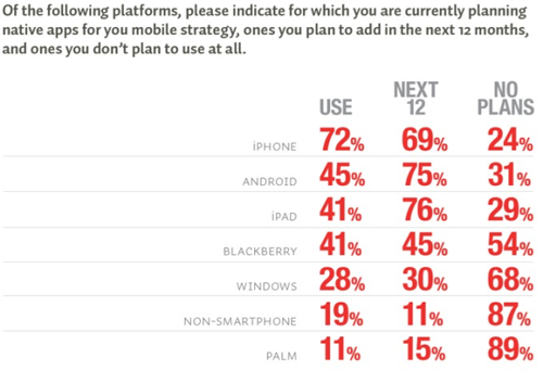 Als het dan toch gaat om apps, blijkt de iPhone het meest favoriete platform onder bedrijven. Een grote meerderheid van 72 procent van de bedrijven actief in apps hebben al een iPhone applicatie. Android is tweede favoriet, met een aanzienlijke afstand op iPhone (45 procent). De interesse voor toekomstige ontwikkeling is het grootst voor Android en iPad.