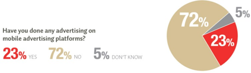 Wanneer we kijken naar adverteren op mobiele platformen geeft slechts 23 procent van de respondenten aan te adverteren. Een overgrote meerderheid heeft dit niet gedaan.