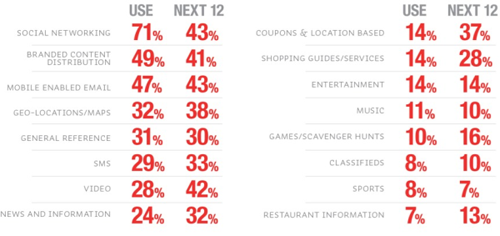 Ingezoomd op de verschillende marketing activiteiten is te zien dat social networking de belangrijkste huidige en toekomstige activiteit is. Opvallend aan deze resultaten is de lage positie van zowel gaming als location based activiteiten.