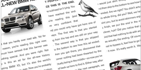 “Hello there. Are you looking for the end of this ad? Of course you are.This is the bottom after all, which is a perfectly logical place to expect to find the end. But it’s not where we put it.” Een banner van 18000 pixels lang, volgestampt met (bijzonder goed gekozen en grappige) tekst over de nieuwe BMW X3. De langste banner ooit gemaakt, althans dat claimt het in Toronto gezetelde bureau Cundari begint als een onschuldige 300-x-250-pixel box, en klapt uit via een mouse-over naar 18,000 pixels lang. Voor de geschiedenis: dat ziet er zo uit (via Adweek, 2 maanden eerder al op BannerBlog, tip via @evr):