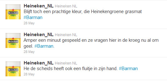Het zal geen voetballiefhebber ontgaan zijn dat dit weekend dé finale plaatsvond tussen Bacelona en Manchester United. Behalve dat het een geweldige wedstrijd was, werd hij ook op Twitter veel besproken. Zoals altijd onder de vaste afkorting hashtag, die in dit geval leidde tot #barman. Hier maakte hoofdsponsor Heineken graag gebruik van, en tijdens de wedstrijd haakte het biermerk hier met leuke tweets op in. Een sterk staaltje hashtag marketing.