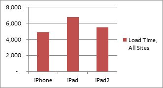 Blaze heeft de onderzochte websites ook aan een speedtest onderworpen. Zo laden de sites geoptimaliseerd voor iPhone 12 procent sneller dan die voor de iPad 2. De gemiddelde paginagrootte is ook 40 procent kleiner (370K) dan die van iPad 2 sites (620K). Rijkere content zorgt hier voor een langere laadtijd. Omdat iPads wellicht minder via 3G worden gebruikt hoeft dit niet per definitie erg te zijn. Opvallend is verder dat iPad 2 sites langer laden dan sites voor de eerste iPad.