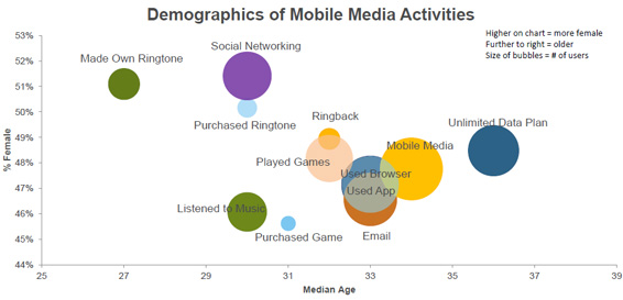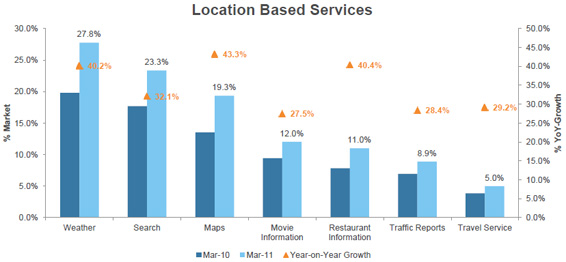De snelst groeiende activiteit zal wellicht geen verrassing zijn: mobile social networking is gegroeid van 40 miljoen naar 60 miljoen gebruikers in maart 2011. Een groei van 45.7 procent. Het mobiel raadplegen van sociale netwerken is daarmee sneller gestegen dan onder andere het opzoeken van weersverwachtingen (+40.2 procent naar 60 miljoen) en persoonlijke email (+30.7 naar 70 miljoen). Zoals op te maken is uit de plannen van Google wordt mobile search steeds belangrijker. Dit blijkt ook uit de cijfers van comScore: mobiel zoeken nam met 32.1 procent toe naar 55 miljoen.