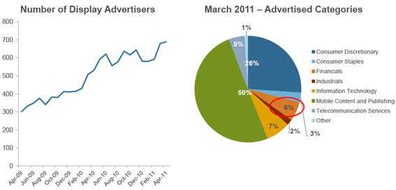 Het aantal mobiele adverteerders is het afgelopen jaar flink toegenomen, zie onderstaande grafiek. Vergeleken met twee jaar geleden is het aantal adverteerders meer dan verdubbeld. Belangrijkste advertentie categorie is mobiele content en publishing (50 procent).