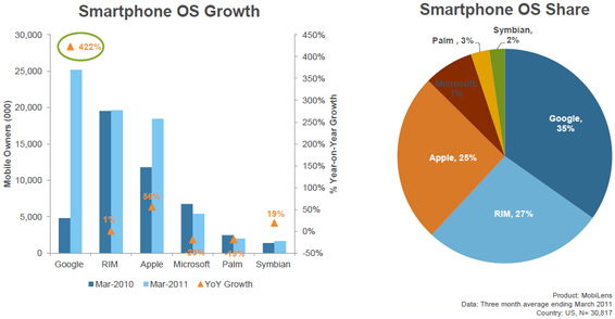 Ook in de cijfers van comScore is de grote winst van Google’s Android te zien. Vergeleken met vorig jaar is het marktaandeel van Android gestegen met 422 procent en is daarmee platform marktleider. De aandelen van Microsoft en Palm zijn geslonken.