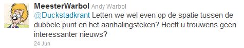 Thought Leadership: de verschillende karakters laten stuk voor stuk zien hoe je als Twitteraar de wereld toont dat je weet wat er speelt rondom één of meerdere onderwerpen. En hoe je hier je contentstrategie op kunt aanpassen. Elk karakter focust zich namelijk op specifieke onderwerpen, waarmee ze een bepaalde verwachting en relevantie opbouwen. Zo heeft Dagobert Duck regelmatig handige tips voor de beginnende ondernemers en bij Joe Carioca kun je terecht voor een bonte verzameling openingszinnen. Mijn persoonlijke favoriet is Andy Warbol, de verstrooide schoolmeester die Jan en alleman terecht wijst op spel- en taalfouten. Het laat zien dat verschillende accounts verschillende doelen dienen en elkaar zo kunnen aanvullen.