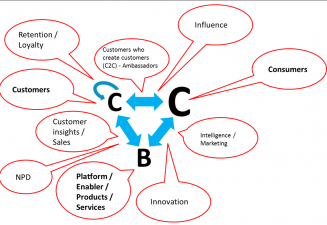 Een C2B2C organisatie is een organisatie waarbij de klant aan het begin en aan het einde van de keten staat, waarbij de organisatie de vertaalslag maakt van behoeften naar oplossingen, producten en diensten die samen gaan met haar merkwaarden en bedrijfsstrategie. Het is een compromis tussen vóór en dóór de klanten. De afbeelding hieronder geeft een greep uit de diverse disciplines en afdelingen weer die beïnvloedt worden door Social Media in een Open Business setting waarbij er tweerichtingsverkeer is tussen bedrijf en klanten: