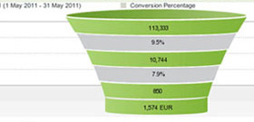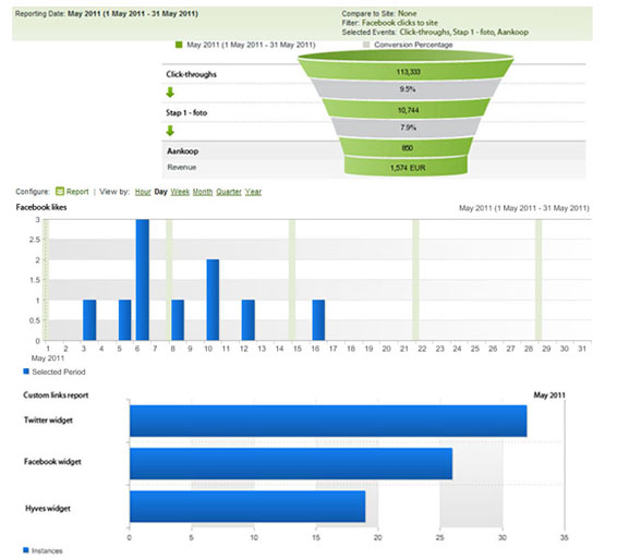 Bovenstaand dashboard bevat het aantal likes per dag, de clicks op de Facebook-widget op de site en het aantal clickthroughs van Facebook naar de website. De gebruikte data zijn fictief. Een conclusie in dit geval luidt dat 0,7 procent van het totaal aantal clickthroughs converteert (een aankoop doet). Een andere conclusie uit dit overzicht is dat het aantal likes (10) achterblijft bij het aantal clicks op de widget (26). De widget leidt de bezoeker naar de Facebook-pagina waar hij of zij op de like-button kan klikken. Bezoekers die op ‘like’ klikken, kunnen ook via een andere weg op de Facebook-pagina zijn beland. Het gat dat we zien tussen het aantal clicks op de widget en de hoeveelheid likes is dus waarschijnlijk in werkelijkheid nog groter dan we kunnen concluderen op basis van deze data.