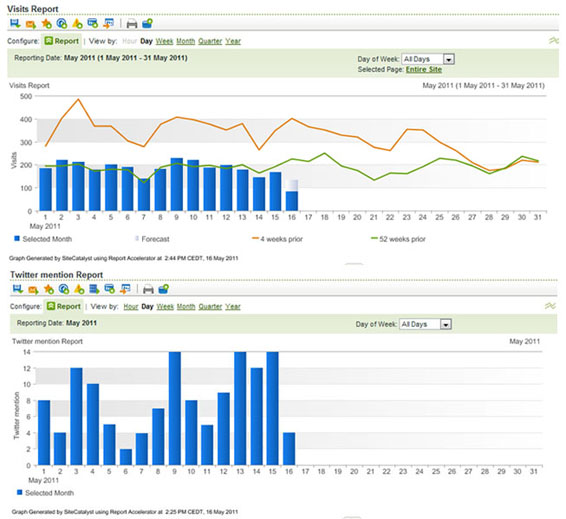 Het is mogelijk om data van social media te integreren in een webanalyticstool. Dit kan onder meer met de nieuwe Social Plugin Tracking tool voor Google Analytics. Maar ook zonder zo’n plug-in zijn er vele mogelijkheden. Niet alleen voor Google Analytics, maar voor alle webanalyticspakketten. Bovendien zijn de mogelijkheden van een dergelijke plug-in vaak beperkt. Het is denkbaar om de opties voor je socialmediametingen uit te breiden naast het gebruik van een dergelijke plug-in. Een eenvoudig voorbeeld van een social media integratie in een webanalyticstool is de Twitter integratie van Adversitement in Adobe SiteCatalyst (het webanalyticspakket dat de organisatie gebruikt). Als Adversitement zijn we gespecialiseerd in web (en multichannel) analytics. Om een goed overzicht van het effect van Twitter te krijgen, houdt de organisatie het aantal Twitter-mentions voor ‘Adversitement’ bij. Deze data is zichtbaar in Adobe SiteCatalyst.