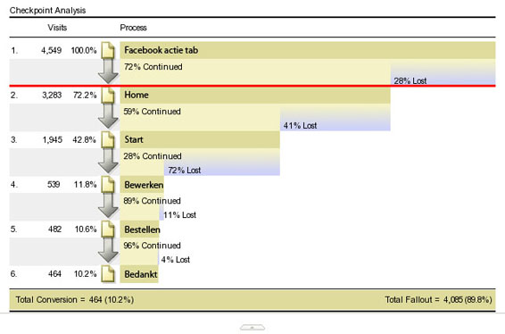 Teruggaand naar het eerdergenoemde voorbeeld, blijkt dat de Facebook-pagina van Pasfoto.nu geen custom tab of Facebook-applicatie heeft. Custom tabs en applicaties geven de mogelijkheid om code toe te voegen, waardoor je exact kunt bepalen wat je wilt meten en hoe. Zo is het mogelijk om custom tabs op te nemen in een Fall Out Report (Adobe SiteCatalyst). Daardoor zie je hoeveel bezoekers van de fictionele Facebook-actietab naar Home gaan en uiteindelijk een pasfoto bestellen.