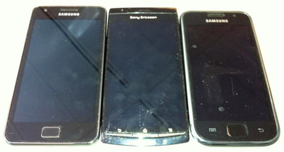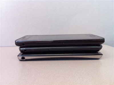 Foto boven: bovenop de Galaxy II, dan de Galaxy I en onderop de Sony Experia arc. Onderste foto: v.l.n.r.: Galaxy II, Xperia arc en de Galaxy I. Persoonlijk vind ik dat je toestellen ook te groot kunt maken. Het fijne handzame gaat er vanaf, het past niet fatsoenlijk meer in je broekzak of borstzak.