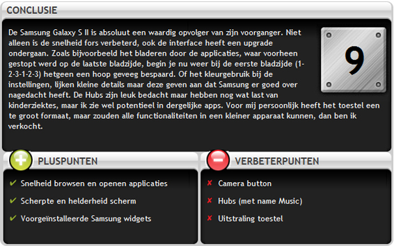 Waar het eveneens forse formaat van de Xperia arc nog enigszins gecompenseerd werd door het fraaie uiterlijk (zilveren band en de “curve” aan de zijkant) is de Galaxy II vrij basic. Niks geen design-aspecten maar een simpel rechthoekig toestel. De hoeken zijn nog wel rond afgewerkt. Net als zijn voorganger voelt ook dit toestel enigszins goedkoop aan. De achterzijde is licht geruwd waardoor het wel goed in de hand ligt en prettig vasthoudt. Al met al heeft het uiterlijk van het toestel niet echt een x-factor.