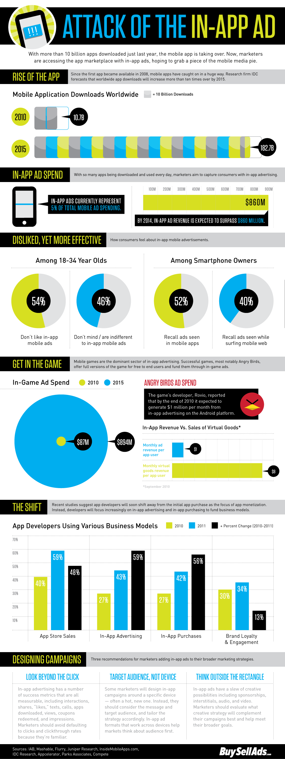 Hoewel gebruikers niet houden van in-app advertising, zijn ze wel effectiever. De opbrengsten uit in-app advertising zullen in 2014 volgens IDC de 860 miljoen dollar bereiken. Zomaar twee indrukwekkende statistieken uit een infographic over in-app advertising. Daarnaast deze week een infographic over de psychologie van advertising, en over de “vermobilisering” van emailmarketing. En natuurlijk de 2011 versie van de CMO Social Landscape guide, die laat zien hoe sociale media scoren op het gebied van customer communication, brand exposure, traffic naar de site en SEO.
