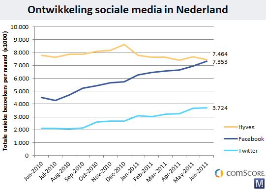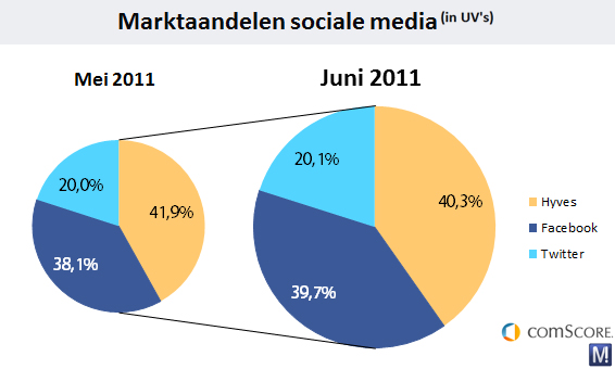 In juni 2011 is het marktaandeel van Hyves verder afgenomen. De cijfers van comScore (N=17.500) van vorige maand lieten zien dat in mei 2011 het marktaandeel juist was toegenomen ten opzichte van de maand ervoor (+3,5 procent). Dit was de eerste overtuigende groei sinds december 2010 toen het aandeel Hyves zijn hoogtepunt bereikte. Een maand later is het marktaandeel Hyves echter toch weer gedaald. Voor de toename het aantal unieke Hyves bezoekers in mei is door zowel mij als comScore moeilijk een verklaring te vinden.