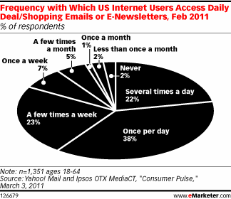Een belangrijk medium voor de dagaanbiedingen is email. Elke dag wordt de dagelijkse aanbieding naar alle subscribers verstuurd. Zo heeft Groupon momenteel een mailing list van maar liefst 83 miljoen mensen. Onderzoek van Yahoo! Mail en Ipsos OTX MediaCT (N=1.351) laat zien dat de Amerikaanse internetbevolking gemiddeld lid is van 3 dag- of weekaanbiedingmails. Van de subscribers leest 22 procent de emails meerdere keren per dag, en 38 procent eens per dag. Daarnaast is het doorstuurpercentage indrukwekkend, maar liefst 45 procent stuurt minimaal wekelijks een aanbieding door naar vrienden of familie. Uit een poll van Business Insider komen hele andere cijfers. Daar zegt 34.8 procent van de Groupon leden de dagelijkse emails nauwelijks te openen. Anderzijds opent 25.5 procent vaker de emails in vergelijking met toen ze net lid werden.