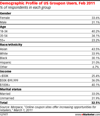 Onderzoek van Morpace vertelt ons dat 32.5 procent van de internet gebruikers Groupon coupons hebben gedownload. Groupon gebruikers zijn voornamelijk tussen de 18 en 34 jaar oud, en hebben een bovengemiddeld inkomen. Daarnaast zijn ze vaker vrouw dan man.