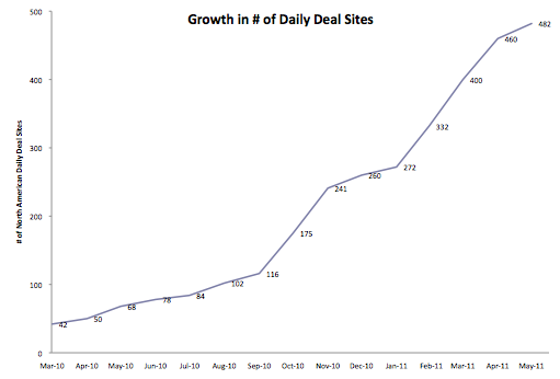 De sterke groei van de markt trekt de aandacht van nieuwe partijen. Data van aggregator Yipit wijst uit dat er momenteel meer dan 480 dagaanbieding sites zijn. Dat aantal is het afgelopen jaar met maar liefst een factor 10! toegenomen.