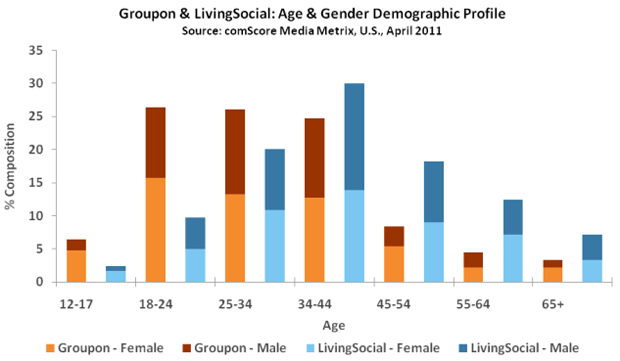 Cijfers van comScore laten zien dat de twee grootste aanbieders, Groupon en LivingSocial, beiden een zeer verschillende doelgroep kennen. Zowel geografisch als wat betreft leeftijd/geslacht. Zo is Groupon populairder onder jongere consumenten, met name vrouwen, terwijl een groot deel van de doelgroep van LivingSocial tussen de 25 en 55 jaar oud is en een redelijk gelijke man-vrouw verdeling kent.