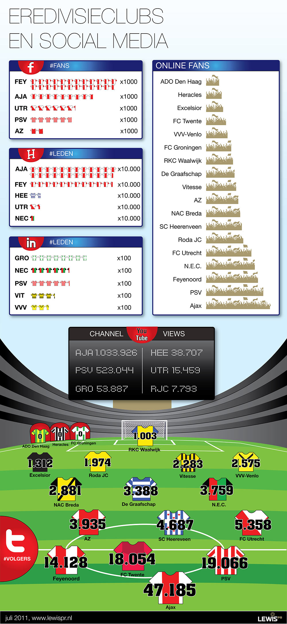 Uit onderzoek van LEWIS PR onder de 18 clubs die komend jaar in de eredivisie uitkomen, blijkt dat Ajax, Feyenoord en PSV de grootste clubs van Nederland zijn als het op social media aankomt. De landskampioen van afgelopen jaar, Ajax, is daarbij het populairst van de Grote Drie. Opmerkelijk genoeg vindt FC Twente, vorig jaar nog de nummer twee uit de eredivisie, zichzelf pas terug op een 14de plaats.