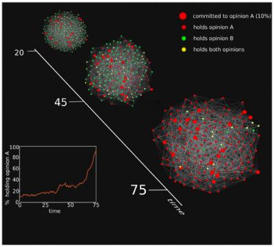 Once the networks were built, the scientists then “sprinkled” in some true believers throughout each of the networks. These people were completely set in their views and unflappable in modifying those beliefs. As those true believers began to converse with those who held the traditional belief system, the tides gradually and then very abruptly began to shift. “
