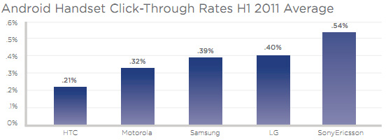 Dat de CTR bij iOS hoger ligt dan bij Android is niet nieuw, de trend is al langer zichtbaar. Zeker als je kijkt naar het Android platform ontbreekt daar de homogeniteit vanwege het grote aantal uiteenlopende devices. Er is dan ook een verschil in CTR tussen de verschillende fabrikanten van mobiele apparaten. Zo is de click through rate voor HTC devices opvallend laag (0,21 procent), terwijl Sony Ericsson een relatief hoge CTR kent (0,54 procent). Samsung en LG zitten hier tussenin.